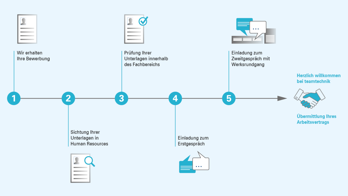 Das freut uns! Hier finden Sie Tipps und Informationen, welche Schritte Ihre Bewerbung auf dem Weg zur neuen Stelle bei teamtechnik durchläuft.