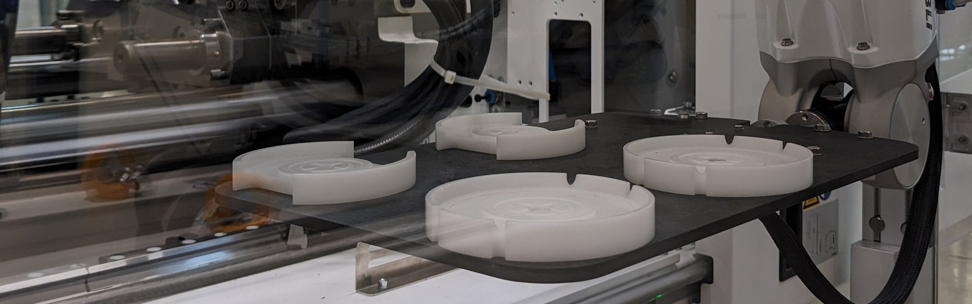 This is why we at BBS have developed a concept for the production of Petri dishes that offers an answer to precisely these requirements. The compact, semi-automated system, consisting of a take-out module with a 6-axis robot, transfer station and manual packaging unit, is also offered as a turnkey solution.